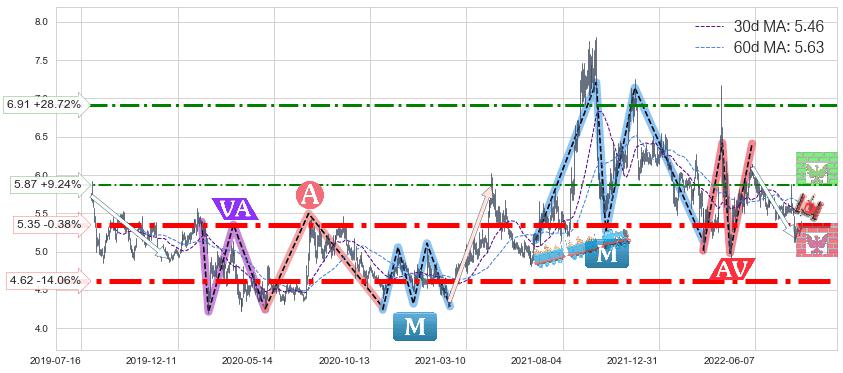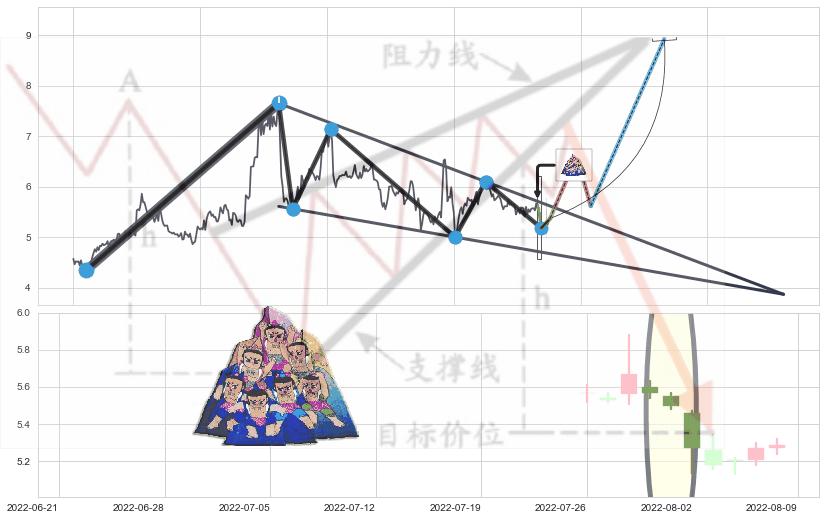 ♘ 阻力价格位5.87,可信任强度51.15%,距离最后交易2022-08-12形成的收盘价格5.37相差 +9.24%