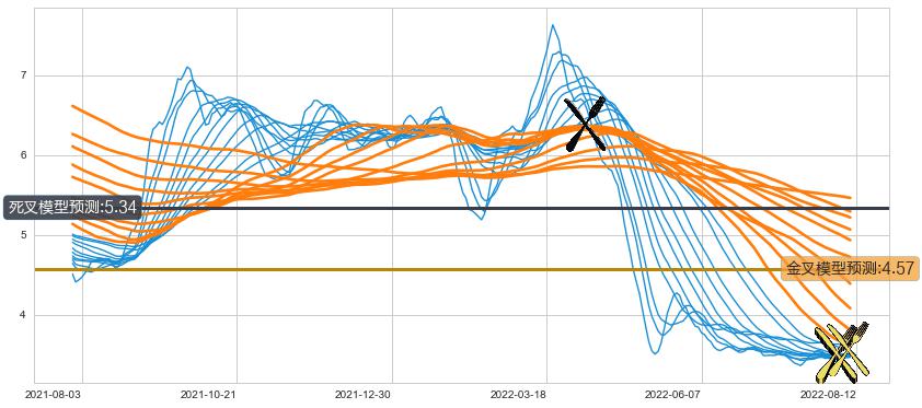 ➢ 60小时均线于(2022-04-07: 6.38)形成【死叉】基于【死叉历史模型】预测死叉后最低波谷价格: 5.42, 死叉后最低价格3.300,已经下跌超出预测最低波谷价格, 预期反弹