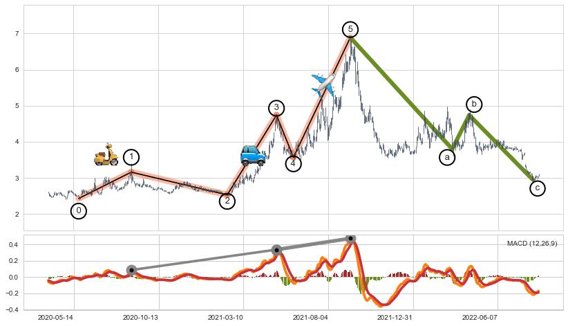 ➣ 波浪理论:猜想达到c点后小回调终止反转上涨 → 上涨 → 【拐点】临近 → 阶段均值回复结束后继续大周期趋势跟踪