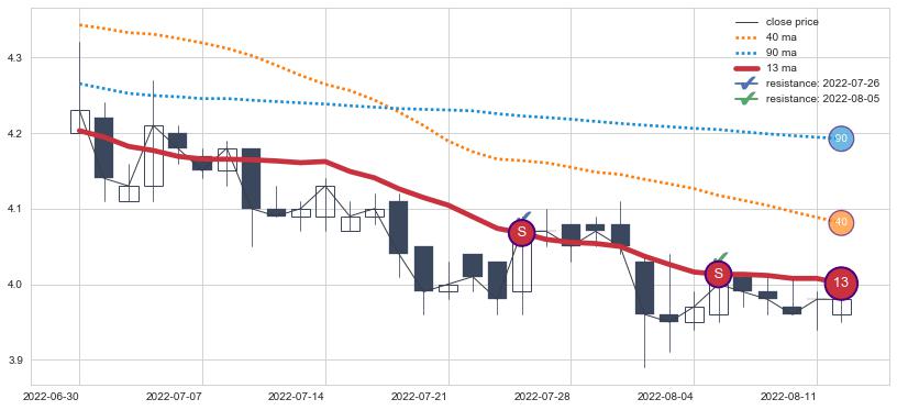 ➣ 40小时均线于(2022-06-10: 4.31)形成【死叉】基于【死叉历史模型】预测死叉后最低波谷价格: 3.804, 死叉后最低价格3.950,尚未达到预测最低波谷价格, 预期继续下跌