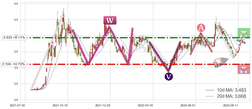 ♘ 阻力价格位3.935,可信任强度81.72%,距离最后交易2022-08-12形成的收盘价格3.640相差 +8.11%