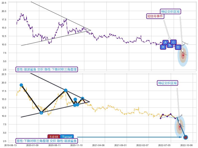 ➢ 谐波鲨鱼属【短级别信号事件】下降对称三角整理属【长级别信号事件】长短周期组合信号事件, 短长事件长度比23.29%