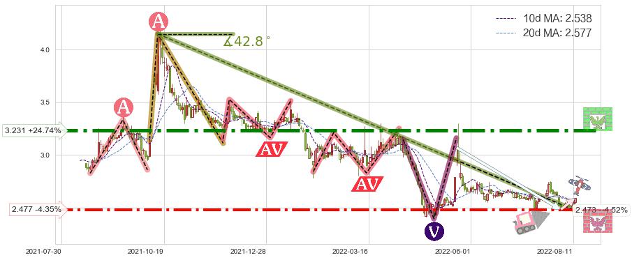♘ 阻力价格位3.231,可信任强度97.72%,距离最后交易2022-08-12形成的收盘价格2.590相差 +24.74%