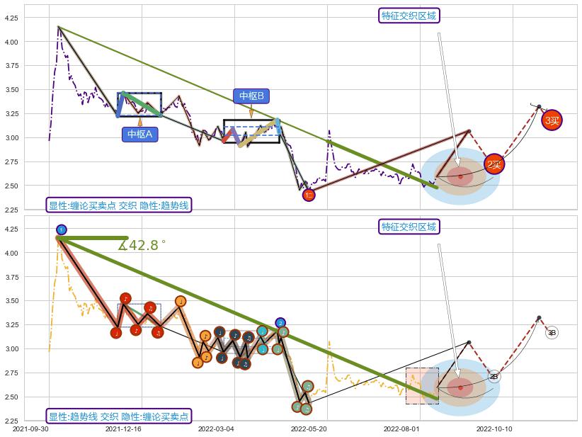 ➢ 【中枢A】:2021-11-29-2021-12-30,中枢由3笔构成,共24交易日, ZG=3.460, ZD=3.230