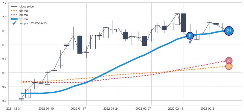 ➣ 55小时均线于(2022-06-27: 6.91)形成【金叉】基于【金叉历史模型】预测金叉后最高波峰价格: 7.58, 金叉后最高价格7.37,尚未达到预测最高波峰价格, 预期继续上涨