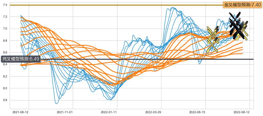 ➢ 90小时均线于(2022-08-05: 6.97)形成【死叉】基于【死叉历史模型】预测死叉后最低波谷价格: 6.47, 死叉后最低价格6.82,尚未达到预测最低波谷价格, 预期继续下跌