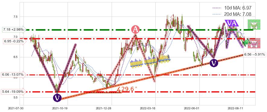 ♘ 阻力价格位7.18,可信任强度91.51%,距离最后交易2022-08-12形成的收盘价格6.97相差 +2.98%