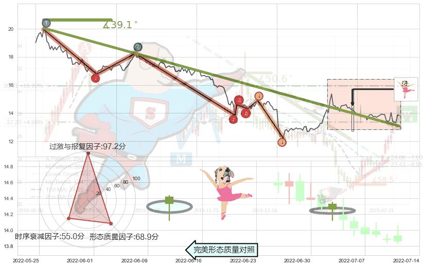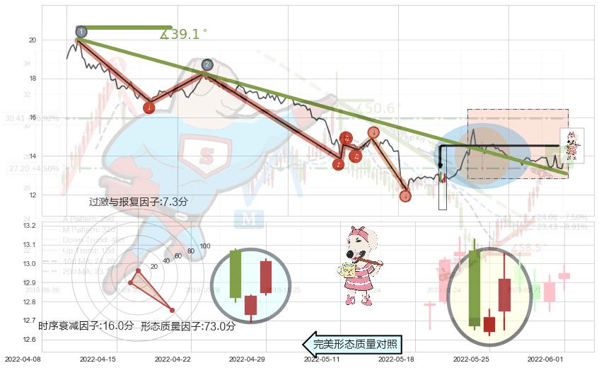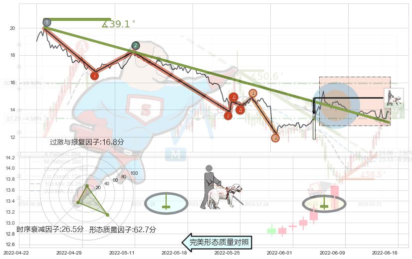 ➢ 2021-01-25-2022-06-14下跌趋势存在反转上涨[机会],其原下跌趋势的阻力位(12.00)已被突破[强支撑信号],原下跌趋势角度: 44.7˚