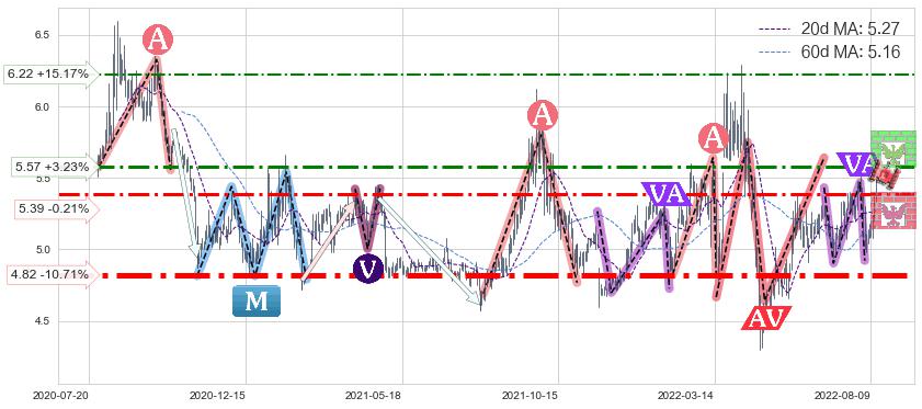 ♘ 阻力价格位6.22,可信任强度52.35%,距离最后交易2022-08-12形成的收盘价格5.40相差 +15.17%