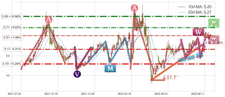 ♘ 阻力价格位5.99,可信任强度77.54%,距离最后交易2022-08-12形成的收盘价格5.40相差 +10.96%