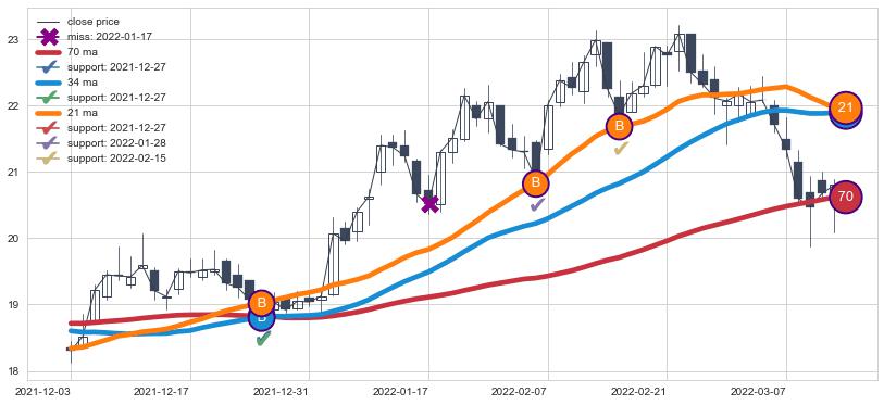 ➢ 最优均线组合共正确确认支撑阻力信号10处,正确确认率 66.67%