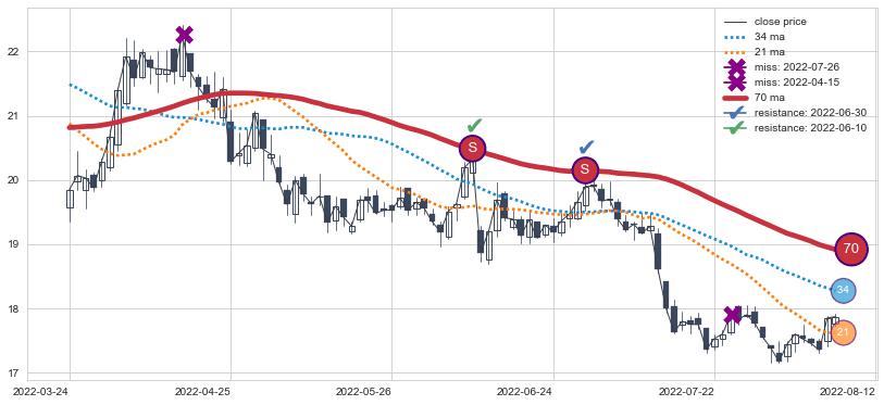 ➣ 34小时均线于(2022-04-28: 20.82)形成【死叉】基于【死叉历史模型】预测死叉后最低波谷价格: 19.63, 死叉后最低价格17.17,已经下跌超出预测最低波谷价格, 预期反弹