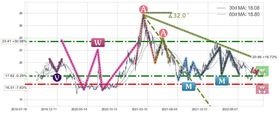 ♘ 阻力价格位17.82,可信任强度83.56%,距离最后交易2022-08-12形成的收盘价格17.87相差 -0.29%