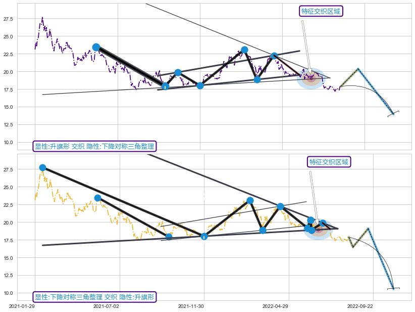 ➢ 下降对称三角整理:下行突破支撑位破位, 猜想持续下沉下跌,被突破的支撑位已变为阻力位