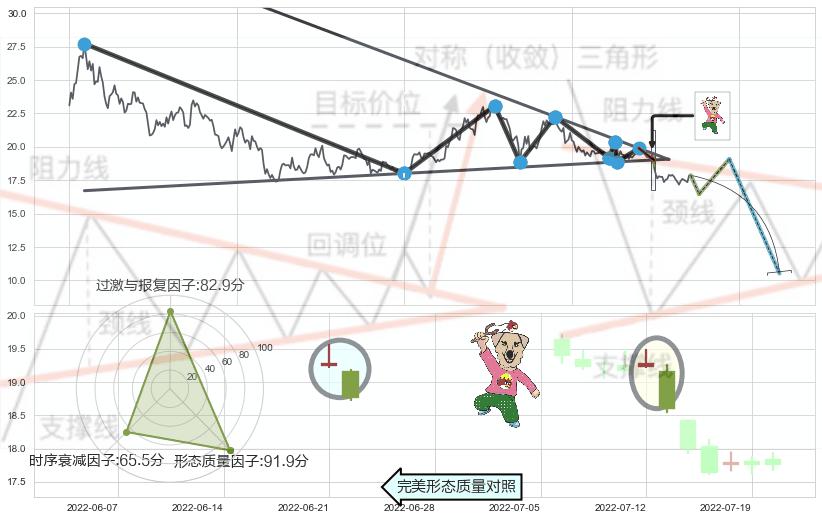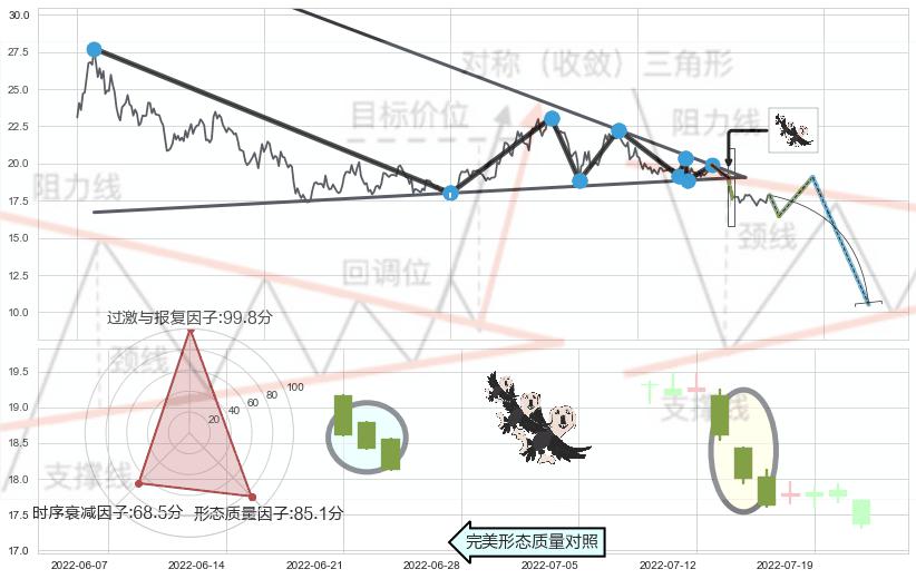 ➣ 【多空双方观望→争持→促使价格波动日益狭窄→空方打破攻守平衡点】对称三角形中继整理, 已在2022-07-13突破【支撑】颈线 19.02 →演变成下降通道