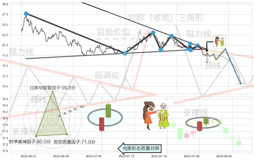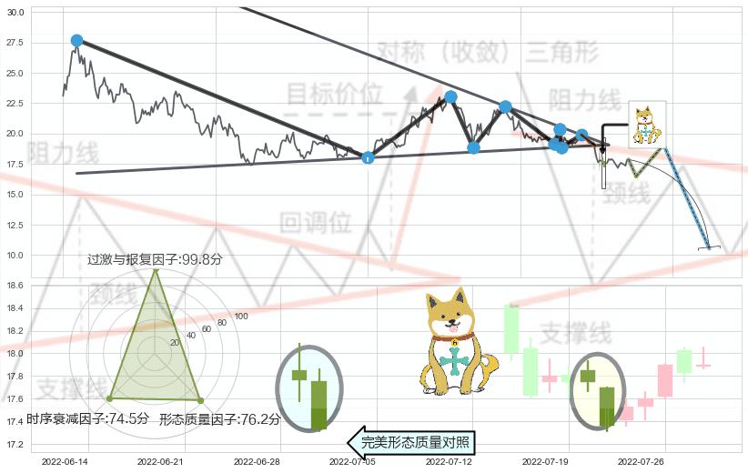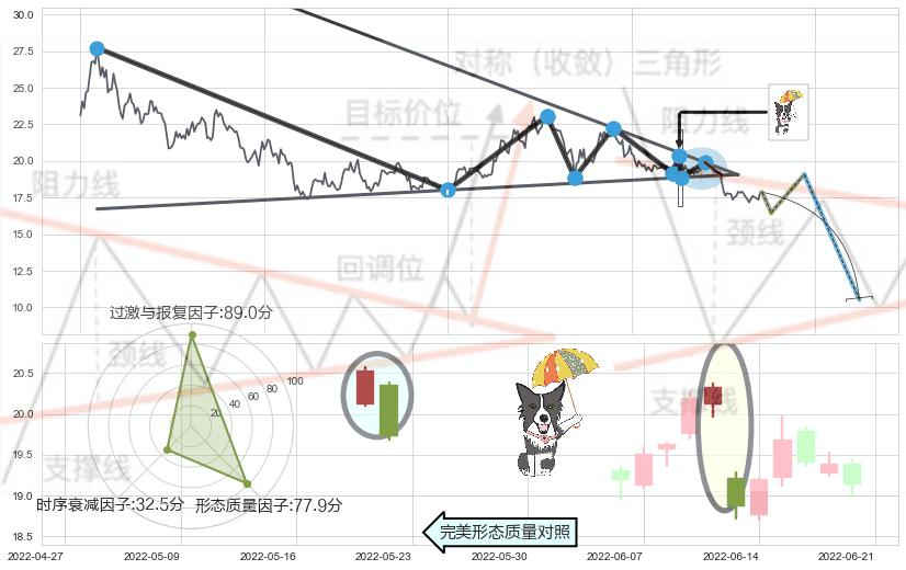 ➢ 射击之星形态 🔜 下降对称三角整理支撑破位转换阻力下跌 综合量化分数:38.59 【偏空】