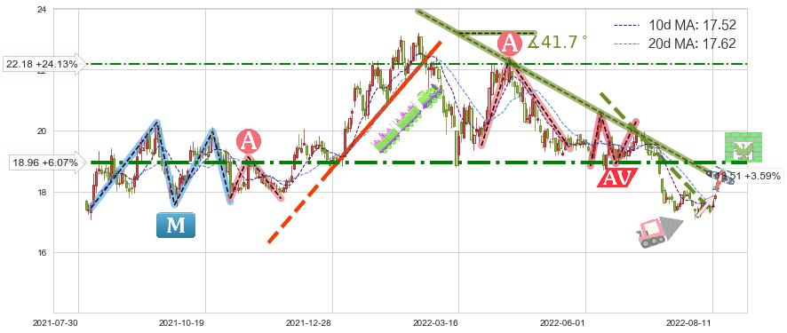 ♘ 阻力价格位18.96,可信任强度83.94%,距离最后交易2022-08-12形成的收盘价格17.87相差 +6.07%