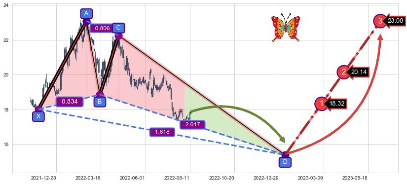 ➣ 谐波蝴蝶:d下跌已到达第❸目标:猜想支撑拉升 → 上涨 →【拐点】机会信号 → 大趋势均值回复
