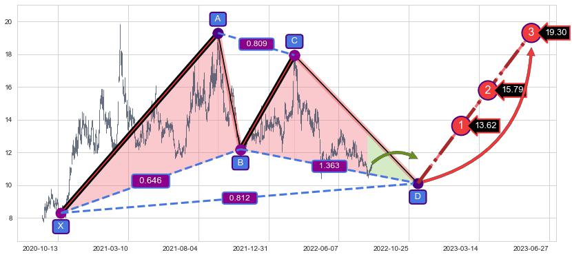 ➣ 谐波伽利:c下跌临近d:猜想拉升 → 上涨 →【拐点】强支撑临近 → 大趋势均值回复
