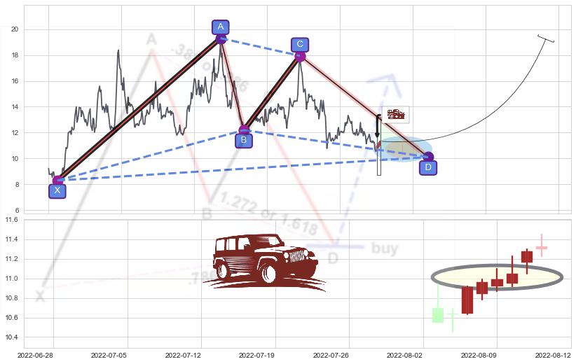 ➢ 谐波伽利:c下跌临近d:猜想拉升 → 上涨 →【拐点】强支撑临近 → 大趋势均值回复