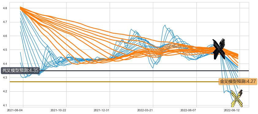 ➣ 55小时均线于(2022-07-13: 4.49)形成【死叉】基于【死叉历史模型】预测死叉后最低波谷价格: 4.33, 死叉后最低价格4.10,已经下跌超出预测最低波谷价格, 预期反弹