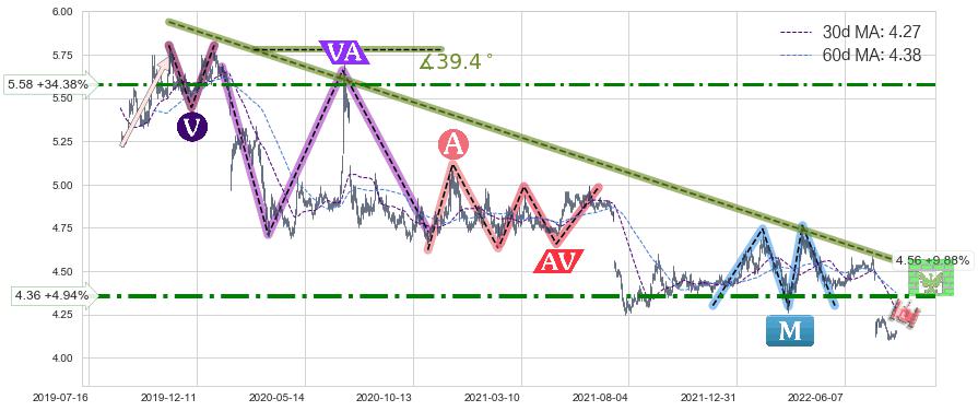 ♘ 阻力价格位4.36,可信任强度74.00%,距离最后交易2022-08-12形成的收盘价格4.15相差 +4.94%