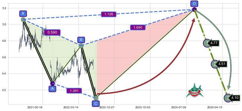 ➣ 未完成【鲨鱼】形态起点X: 2020-12-03, 已到达C点: 2022-08-03, 预测最终D点: 2024-09-09, 共952交易日