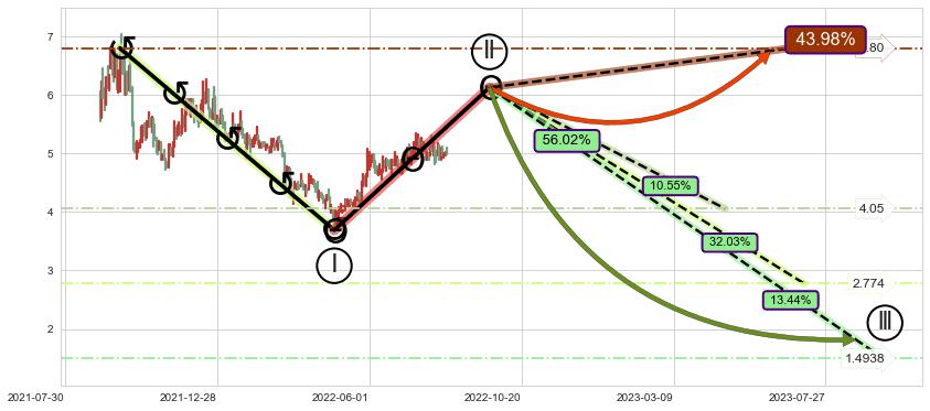 ➣ 循环浪继续向下【平均值】位置(2023-07-07, 2.774),匹配聚类样本比例57.18%, 可能性概率32.03%
