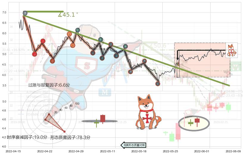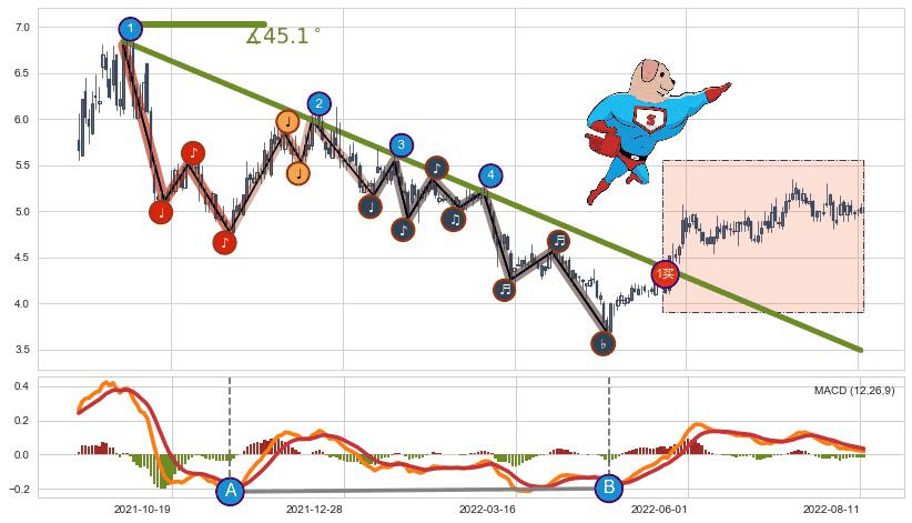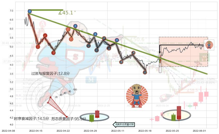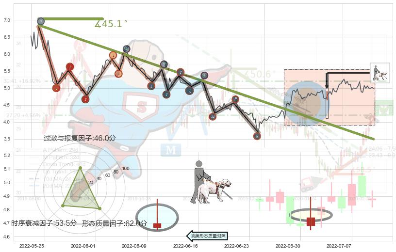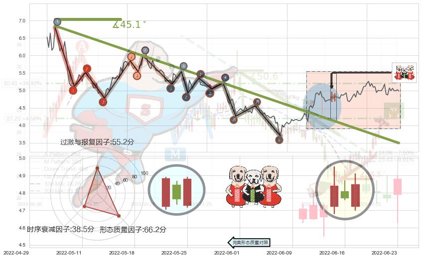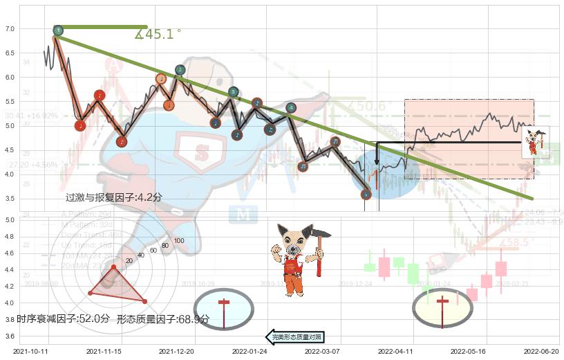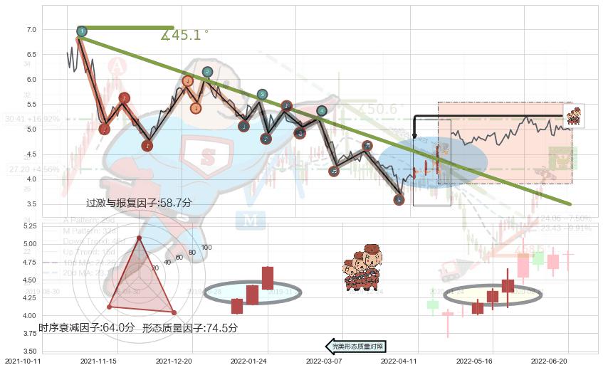 ➣ 2021-09-22-2022-05-25下跌趋势存在反转上涨[机会],其原下跌趋势的阻力位(3.494)已被突破[强支撑信号],原下跌趋势角度: 45.1˚