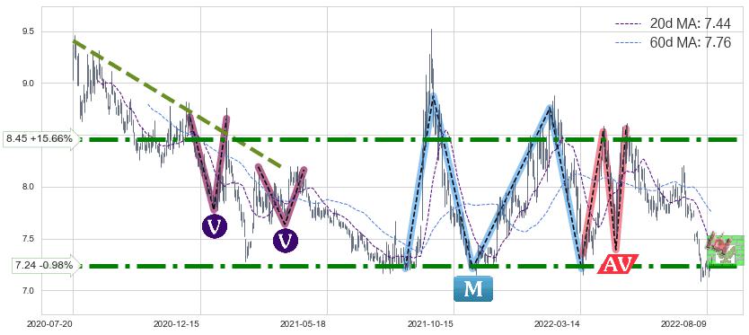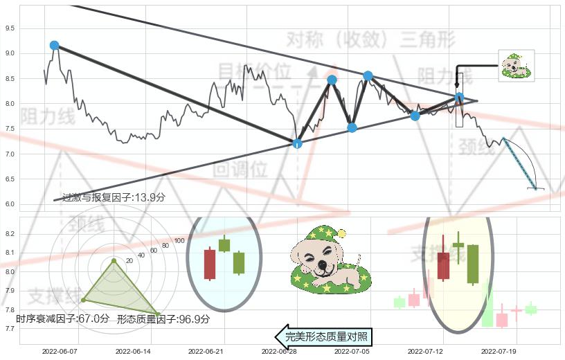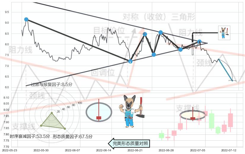 ➣ 【多空双方观望→争持→促使价格波动日益狭窄→空方打破攻守平衡点】对称三角形中继整理, 已在2022-07-14突破【支撑】颈线 7.98 →演变成下降通道
