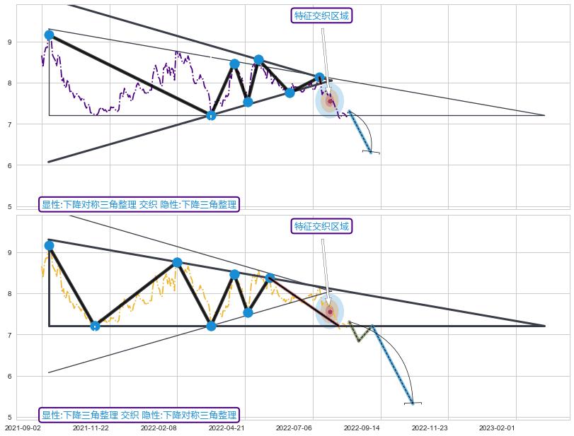 ➣ 下降对称三角整理:下行突破支撑位破位, 猜想持续下沉下跌,被突破的支撑位已变为阻力位