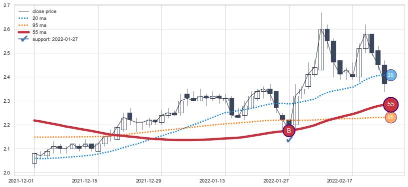 ➢ 55小时均线于(2022-07-13: 2.150)形成【死叉】基于【死叉历史模型】预测死叉后最低波谷价格: 1.9832, 死叉后最低价格1.9900,尚未达到预测最低波谷价格, 预期继续下跌