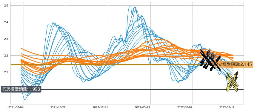 ➣ 60小时均线于(2022-07-13: 2.149)形成【死叉】基于【死叉历史模型】预测死叉后最低波谷价格: 1.9777, 死叉后最低价格1.9900,尚未达到预测最低波谷价格, 预期继续下跌