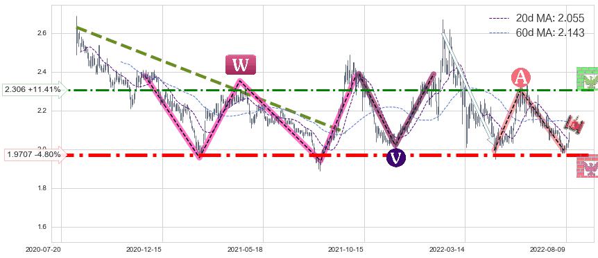 ♘ 阻力价格位2.306,可信任强度69.62%,距离最后交易2022-08-12形成的收盘价格2.070相差 +11.41%