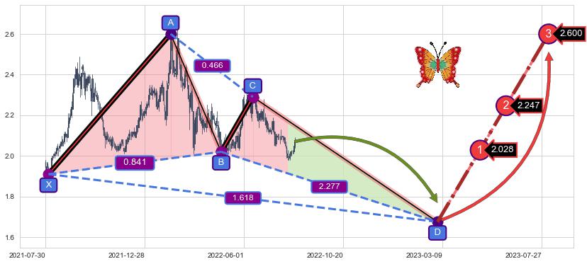 ➣ 未完成【蝴蝶】形态起点X: 2021-08-04, 已到达C点: 2022-06-15, 预测最终D点: 2023-03-02, 共386交易日
