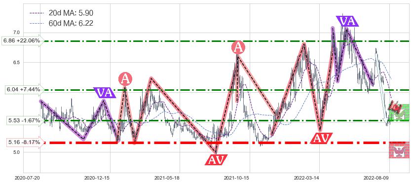 ♘ 阻力价格位5.53,可信任强度57.22%,距离最后交易2022-08-12形成的收盘价格5.62相差 -1.67%