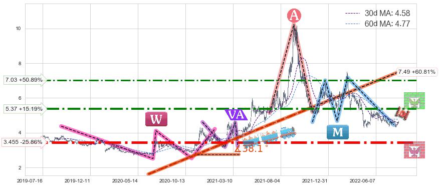 ♘ 阻力价格位7.03,可信任强度69.12%,距离最后交易2022-08-12形成的收盘价格4.66相差 +50.89%