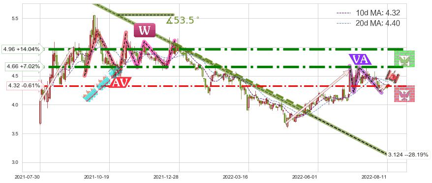 ♘ 支撑价格位4.32,可信任强度60.95%,距离最后交易2022-08-12形成的收盘价格4.35相差 -0.61%