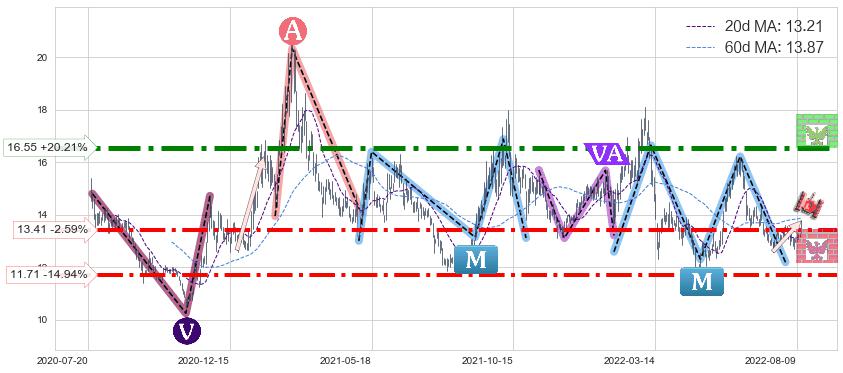♘ 支撑价格位13.41,可信任强度77.52%,距离最后交易2022-08-12形成的收盘价格13.77相差 -2.59%