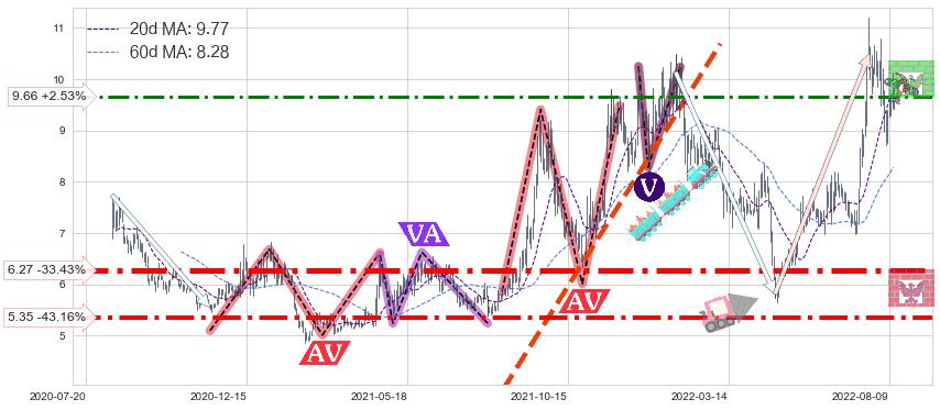 ♘ 阻力价格位9.66,可信任强度63.49%,距离最后交易2022-08-12形成的收盘价格9.42相差 +2.53%