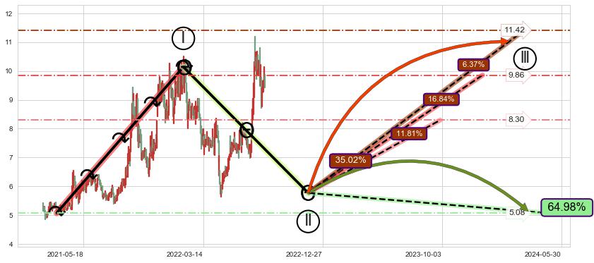 ♘ 支撑价格位6.27,可信任强度97.21%,距离最后交易2022-08-12形成的收盘价格9.42相差 -33.43%
