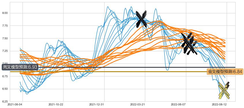 ➣ 180小时均线于(2022-06-08: 7.46)形成【死叉】基于【死叉历史模型】预测死叉后最低波谷价格: 6.70, 死叉后最低价格6.26,已经下跌超出预测最低波谷价格, 预期反弹