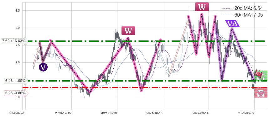 ♘ 阻力价格位7.62,可信任强度95.37%,距离最后交易2022-08-12形成的收盘价格6.53相差 +16.63%