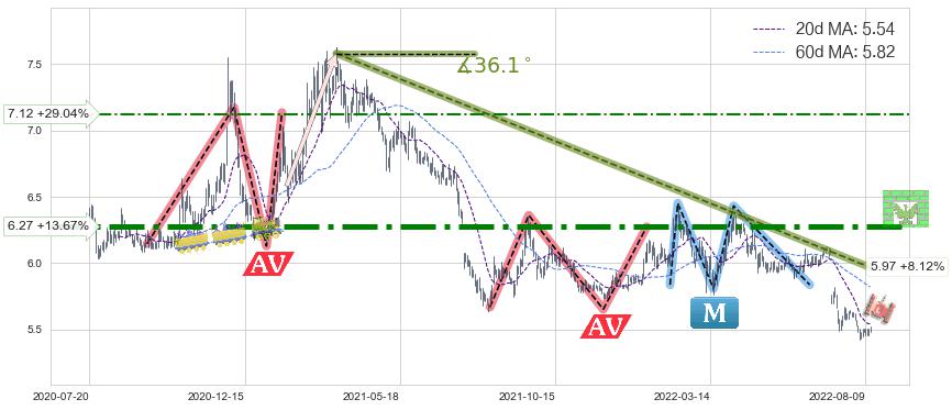 ➣ 【多空双方观望→争持→促使价格波动日益狭窄→空方打破攻守平衡点】对称三角形中继整理, 已在2022-07-08突破【支撑】颈线 5.89 →演变成下降通道