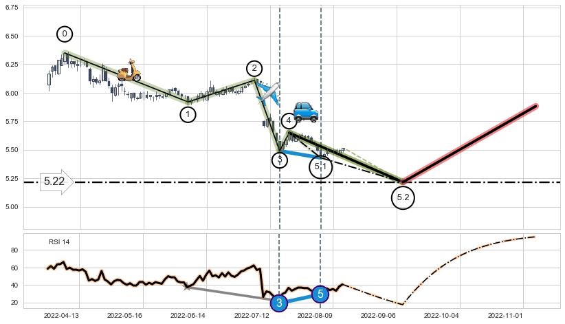 ➣ 5.1: 预测当前第5浪位置(2022-08-03, 5.43),仍然有下跌空间