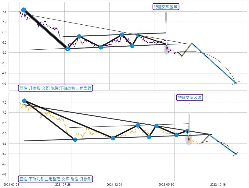 ➢ 下降对称三角整理:下行突破支撑位破位, 猜想持续下沉下跌,被突破的支撑位已变为阻力位