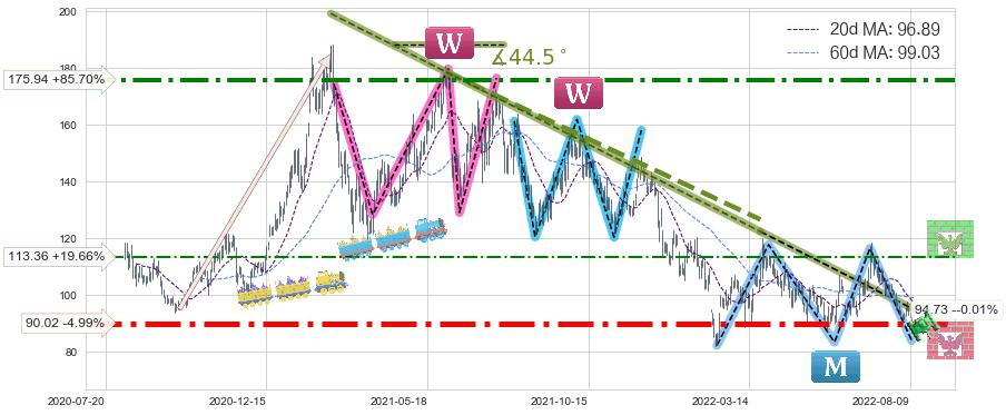 ♘ 支撑价格位90.02,可信任强度94.53%,距离最后交易2022-08-12形成的收盘价格94.74相差 -4.99%