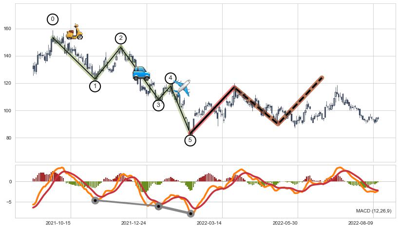 ➣ 波浪理论:猜想达到c点后小反弹终止反转下跌 → 下跌 → 【拐点】临近 → 阶段均值回复结束后继续大周期趋势跟踪