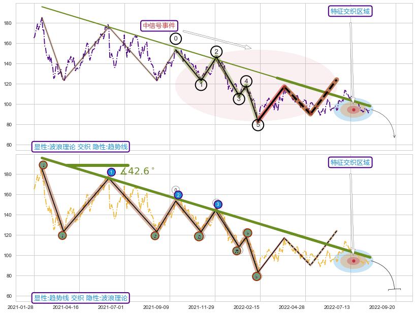 从2021-02-10至2022-03-23,共包含268个交易日,阶段股价下跌-34.48%,阶段股价变动位移路程比: 1 : 20,下跌趋势角度: 44.5,2021-06-08向↘︎形成缺口,跳空下跌-17.54%˚