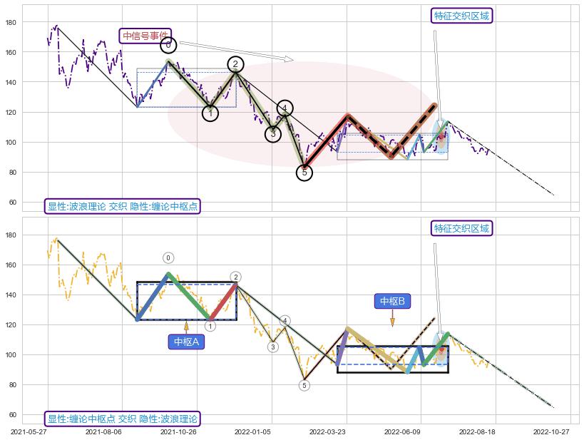 ➣ 缠论中枢点:猜想破位中枢B后持续下拉 → 下跌 → 破位中枢B支撑 → 持续趋势跟踪